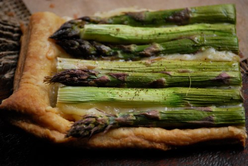 This Asparagus and Gruyere Tart is so easy it’s almost embarassing to write a blog post about. The ‘crust’ is made from puffed pastry. If your not familiar with this little gem, you can either choose to make your own (which can take a little while), or you can buy it ready-made from the grocery store. This is one of those few times where I recommend buying the pre-made product– it’s in the freezer section, and is generally high-quality and easy to work with.