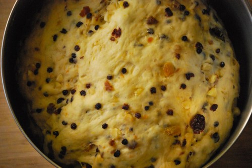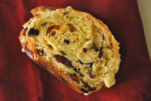 Apparently this is the month I make treats that I’ve had in mind for years, but never gotten around to. First it was this amazing chocolate mint cake that I thought about for a decade, now it’s a gorgeous stollen. Hey, I’ve only lusted after this fantastic bread for 9 years. I know many of you plan to entertain family and friends for the holidays, so put this one on your list. It really stands out from the crowd. This stollen is not only beautifully interesting, it’s absolutely delicious. It’s loaded with good things like dried fruit, almonds, lemon and orange zest; and great things like…cognac!