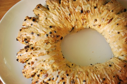Mix the confectioners’ sugar with the orange juice. Drizzle over the stollen. Serve warm, if desired. Keeps very well in an airtight container and plastic wrap snug around the cut ends. Enjoy!