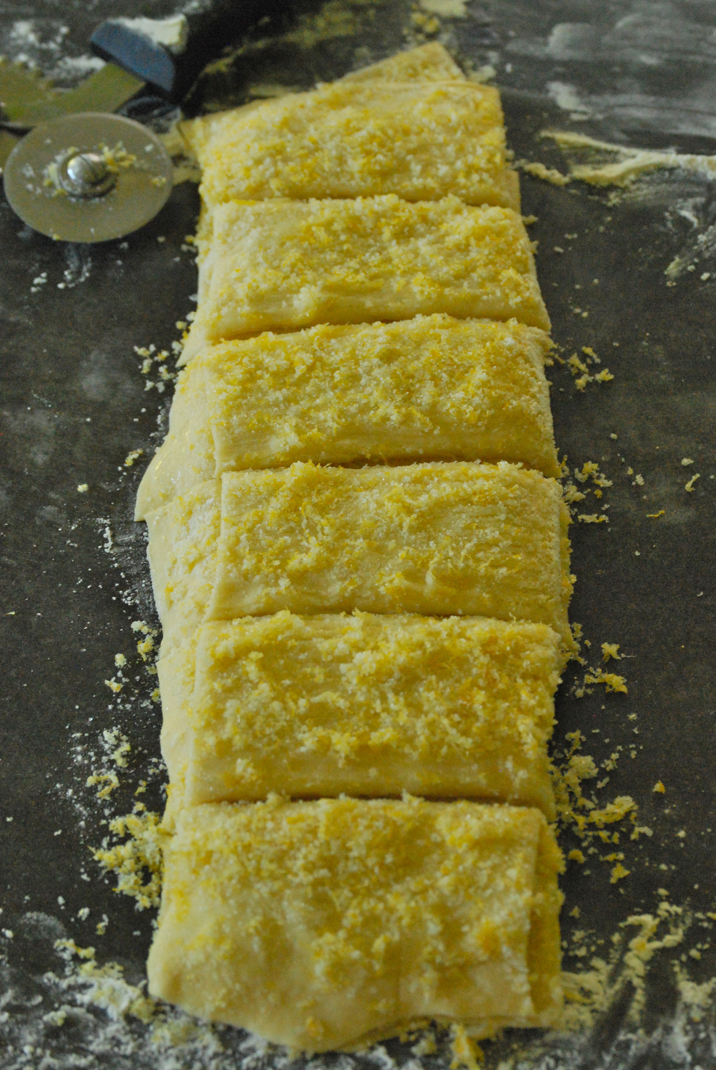 On a lightly floured work surface roll the dough out to a 20 x 12 – inch rectangle. Use a pastry brush (or smear with your hands) to distribute the melted butter onto the dough. Sprinkle the lemon/sugar mixture evenly over the melted butter. Give the mixture a gentle pat so that it sticks well. Using a pizza cutter, cut the dough crosswise into 5 equal strips (each about 12 x 4 – inches). Carefully stack all 5 strips of dough. Again using the pizza cutter, cut the stack into 6 equal sections (each about 4 x 2 -inches).