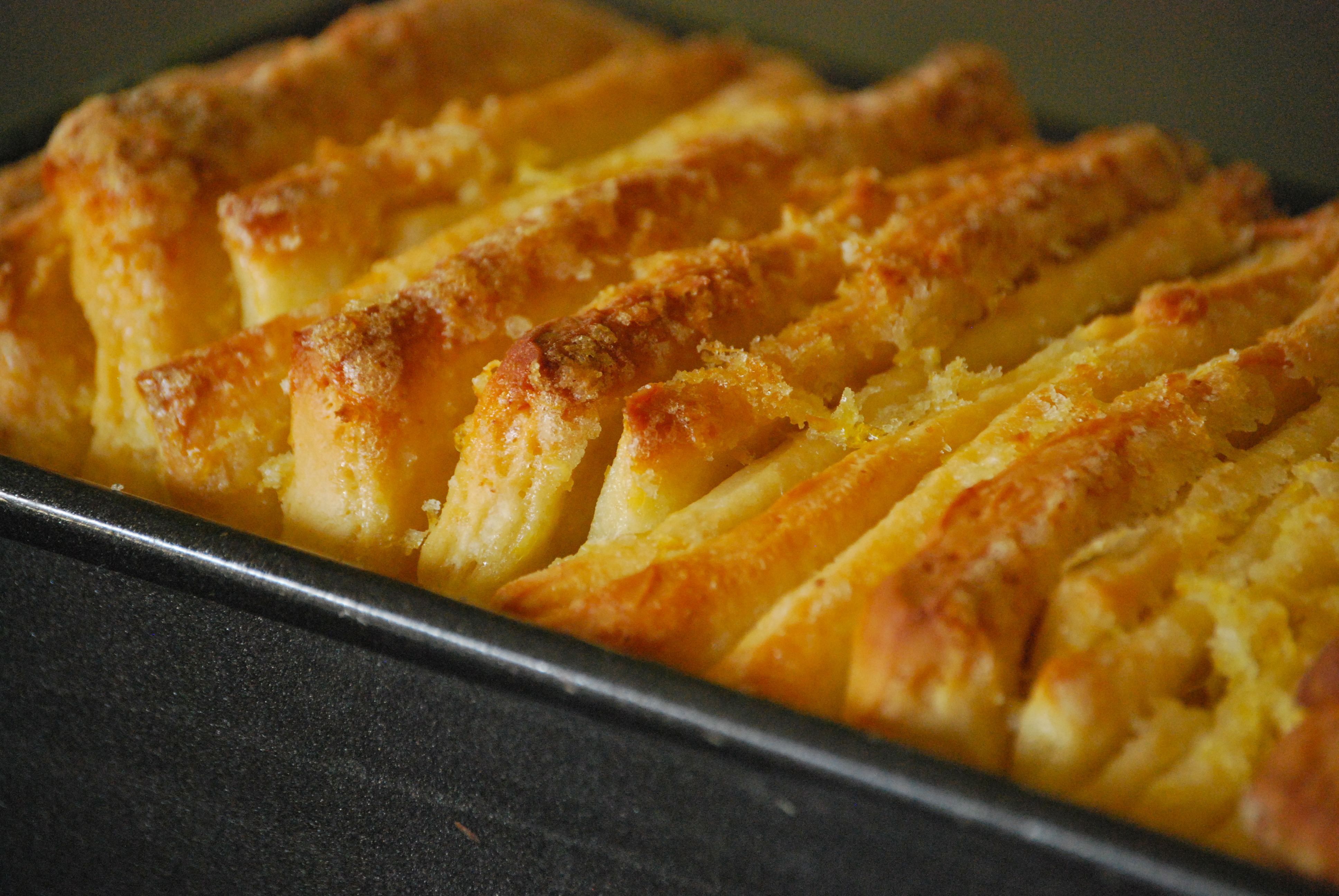 Don’t be intimidated by the recipe’s length– it’s not difficult. The photos here show you how to cut the dough, which seemed to be the most confusing part of the original directions. Just remember the goal– make a dough, let it rise, roll it into a large rectangle, top with lemon/sugar mixture, cut into 30 small, equal rectangles, stack in a bread pan, let rise, and bake. That’s it. The cutting measurements don’t have to be perfect, so slight variations in shape are just fine. The key is to make sure you bake it long enough. Otherwise, the center may not be done, which will ruin your bread. If you make the dough and store it in the refrigerator, you’ll find it really shortens the wait if you plan on making it for breakfast. Enjoy!