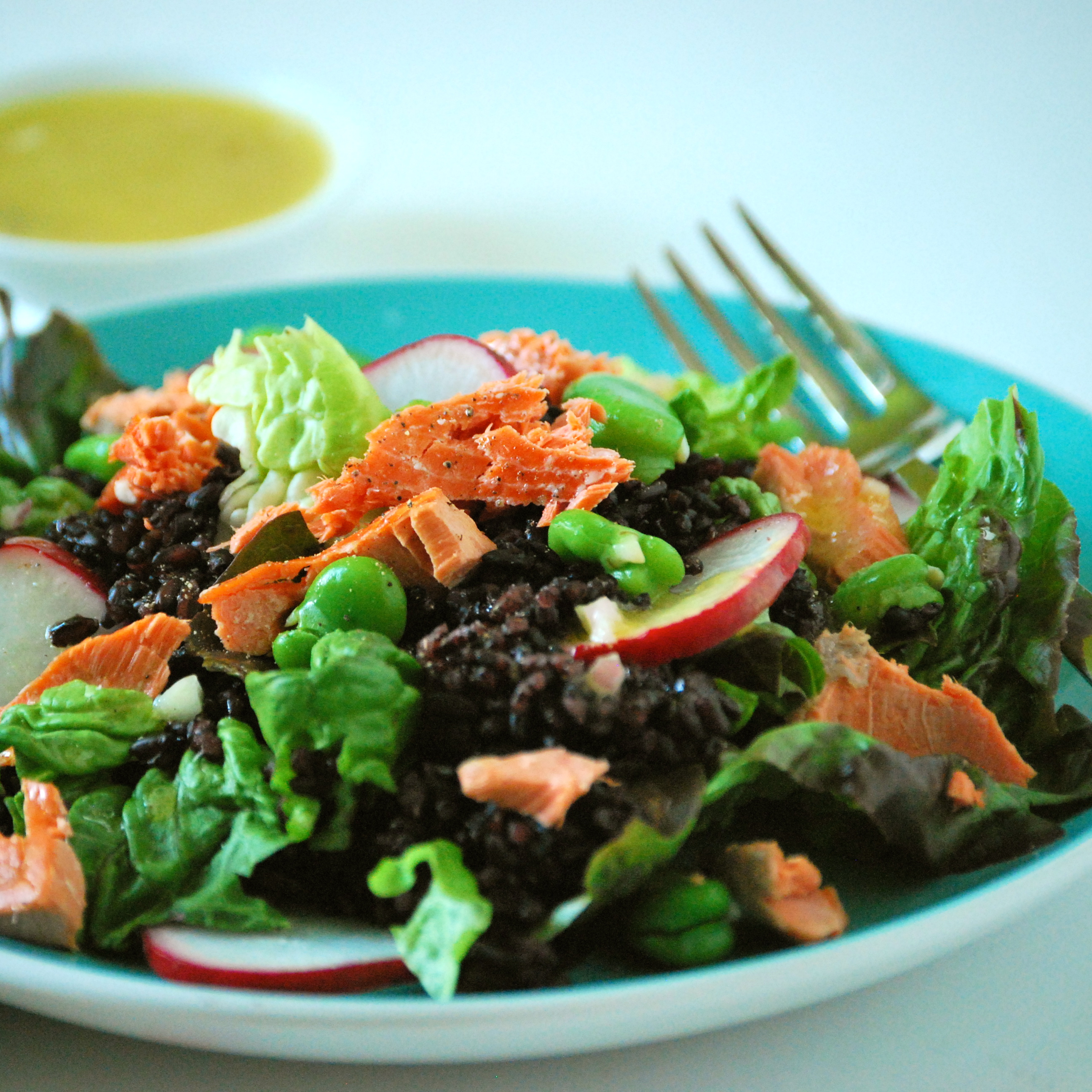 Along with the salmon, this salad has those wonderful Spring fava beans and radishes. The beans add a nice ‘pop!’ of color along with their firm texture, while the radishes give the dish a healthy crunch. Another ingredient is black rice. Not familiar? You can read about it here. Aside from looking pretty cool, it’s loaded with fiber and iron. It’s also an anti-inflammatory and great source for antioxidants. I used ‘forbidden’ black rice in this dish. The texture is the same as a firm white rice, but the flavor is a bit more ‘nutty’– kind of like wild rice. If you can’t find black rice, you can use wild rice, quinoa, or wheat berries. All will work well here.