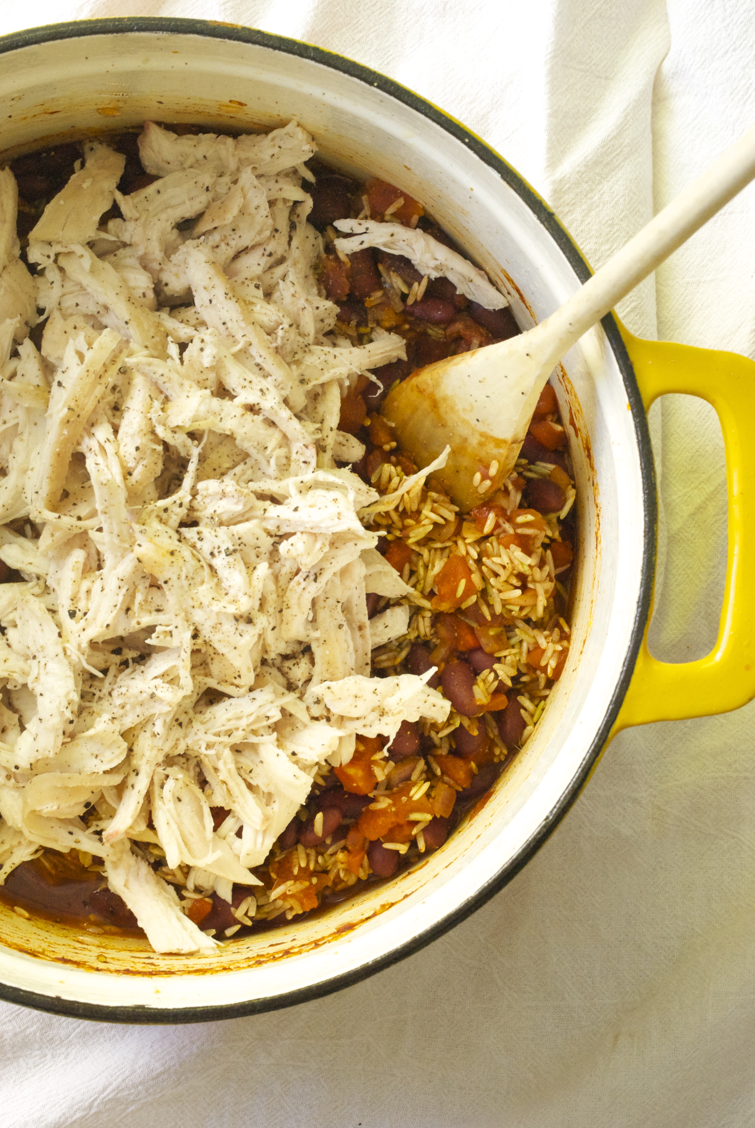 In a large Dutch oven add a couple tablespoons of olive oil and sauté the onion and garlic for a couple of minutes over medium-high heat until somewhat soft (you would brown the ground beef just prior to this, if using). Add the chili powder, cumin, coriander, about 1-2 teaspoons of kosher salt, and cracked pepper to the pan. Then add the canned tomatoes with juices, beans, rice, meat, corn, and heated broth and continue to cook for a couple of minutes over medium-high heat until everything is hot.