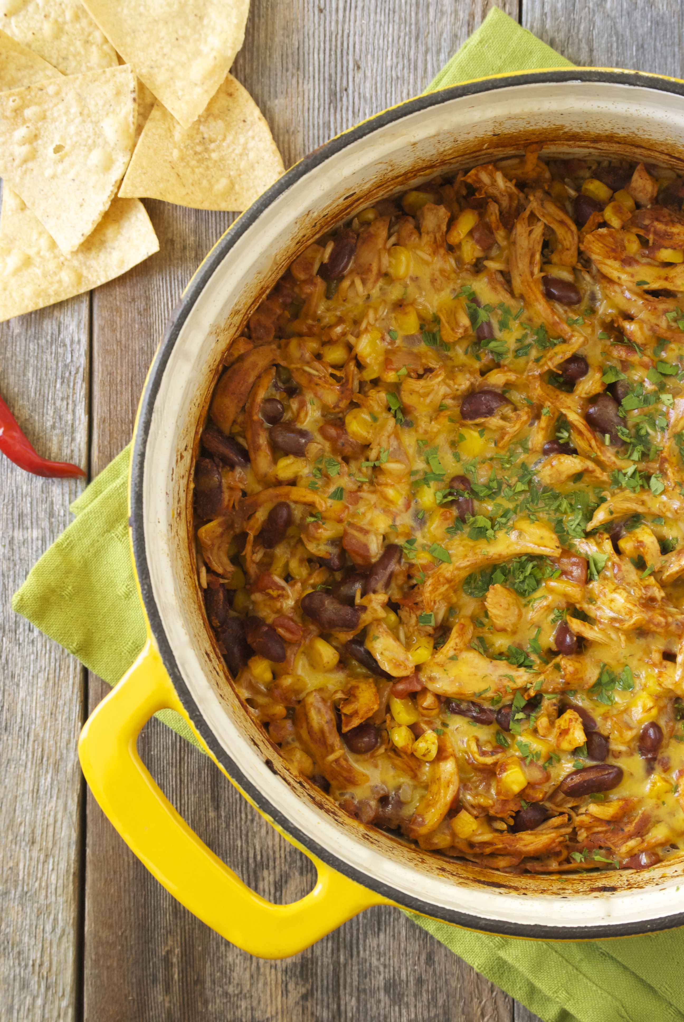 This dish is fabulous with shredded chicken or turkey, but it’s also equally tasty using ground beef (or shredded beef, if you happen to have that). Substituting beef broth for the chicken broth is an easy swap. Of course, going completely vegetarian is a no-brainer, too. Just add more beans and use vegetable broth, or even water. Just amp up the spices a bit more to compensate. Whatever protein you decide to use, it will pair wonderfully with the brown rice, corn, and beans.