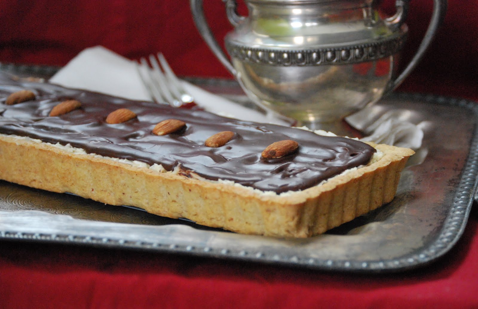 Greetings! I hope you’ve had a wonderful week and that you’re managing to stay warm (it’s -20 F windchill as I write this!). While these late winter months really test my patience, I always look forward to the middle of February for one reason– Valentine’s Day! Have you made YOUR plans yet? Though my husband has always griped that it’s a holiday created by Hallmark, deep down I know he looks forward to it as much as I do. We have a simple tradition started years ago while we were dating. Born partly out of having been poor college kids, and partly out of not wanting to fight the restaurant crowd, we originally spent a romantic night at home, just the two of us making pasta, drinking wine, and enjoying a decadent chocolate dessert. Now we’ve continued the tradition, though we’ve added our two children. Not quite as romantic perhaps, but just as fulfilling. To be honest, I can’t imagine it any other way. Part of the fun in making it a family event is that my little four-year-old boy helped me pick out the dessert this year. What you see is the Coconut Almond Tart that he chose.
