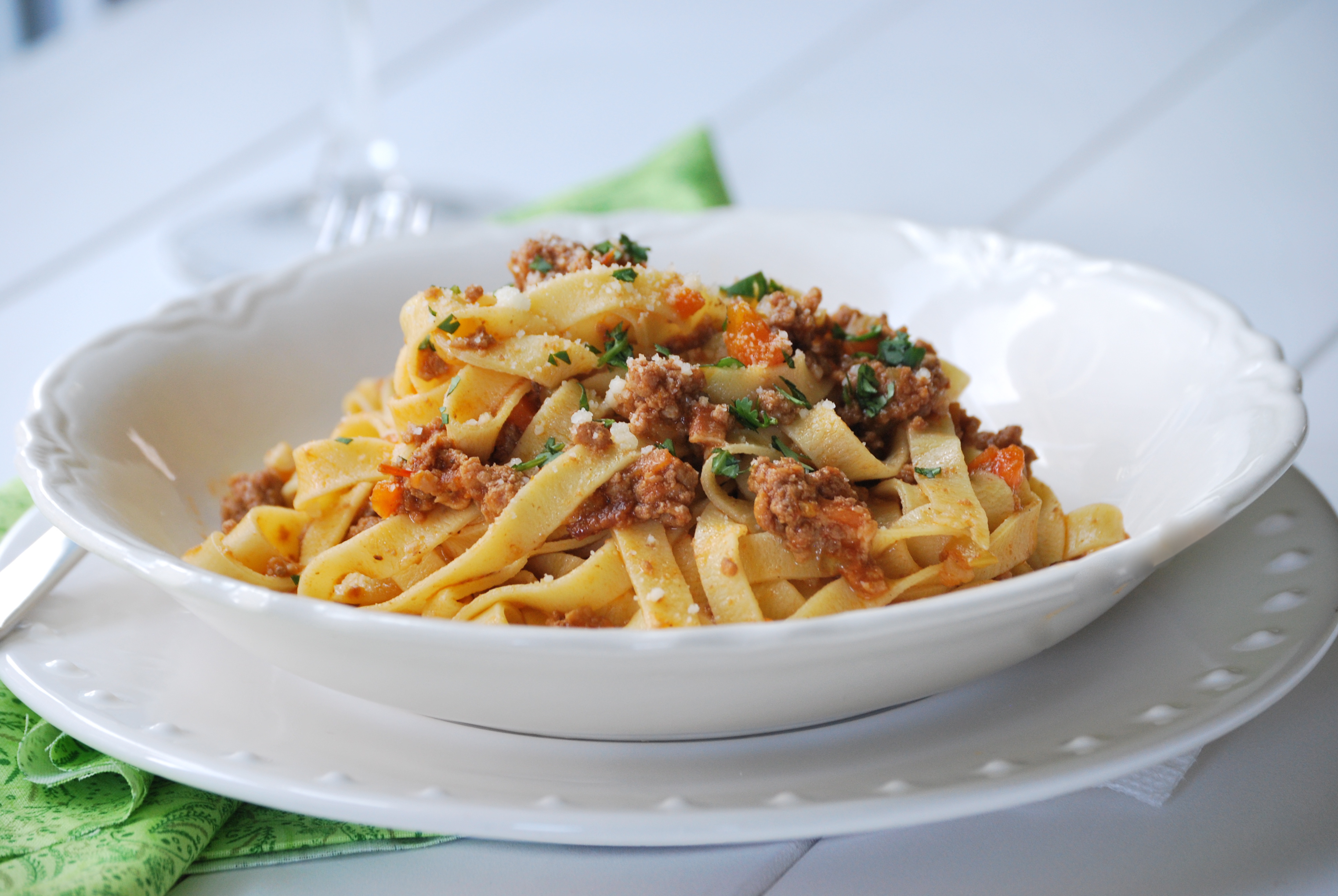 Source: Homemade Tagliatelle adapted from Lidia Matticchio Bastianich’s Lidia’s Family Table. Bolognese recipe is my own.