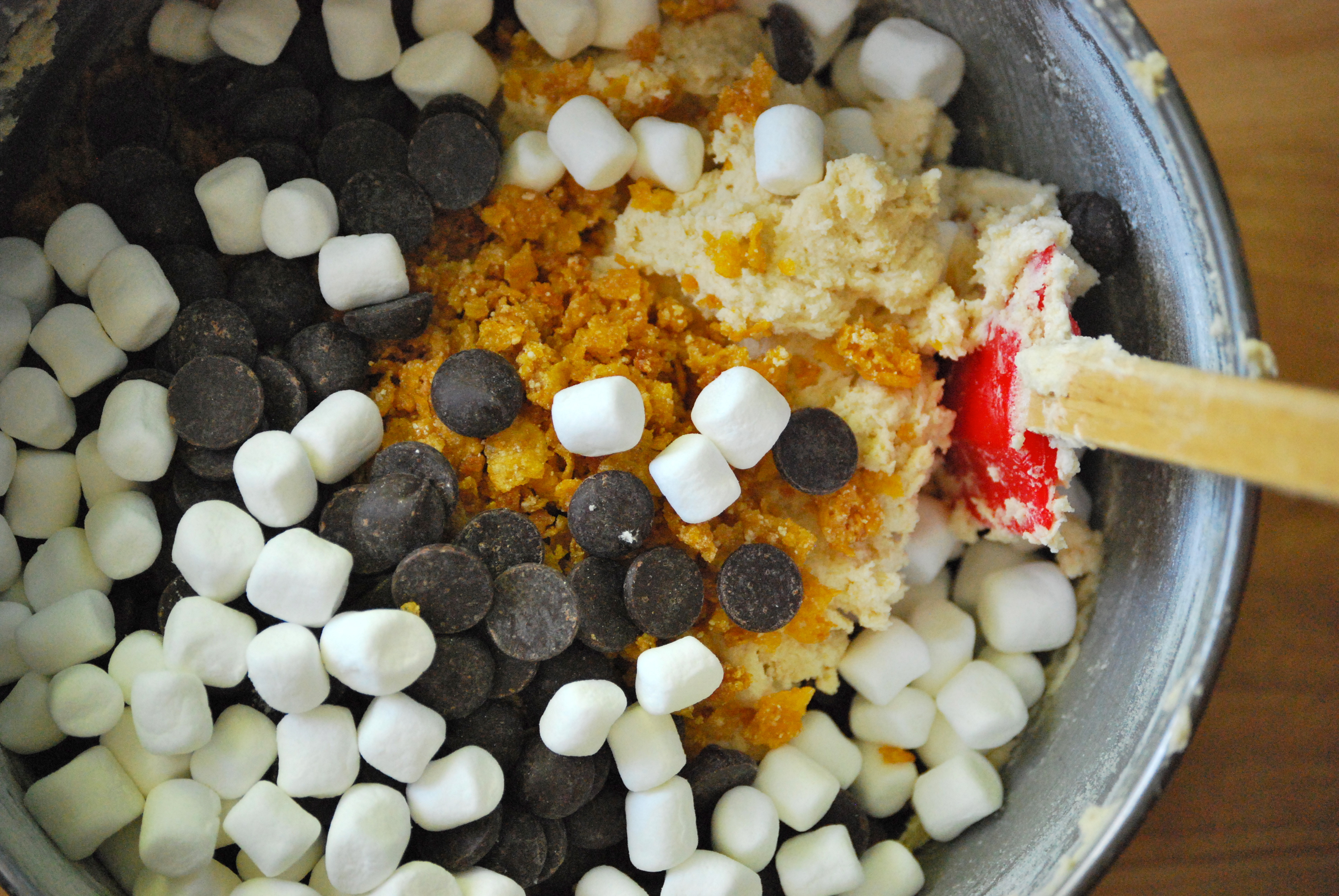 In a bowl of a stand mixer fitter with a paddle attachment (or use a regular bowl and wooden spoon), beat the butter and sugars together until nice and creamy, about 2 minutes. Then add the egg and vanilla and beat on medium for about 3-4 minutes, or until the mixture is light and fluffy and has incorporated enough air into it. Remember to scrape down the sides with a rubber spatula along the way. Then add the flour mixture to the butter and mix just until everything is incorporated. Do not over-mix. Remove bowl from the stand mixer and using a rubber spatula, fold in the white chocolate chips, 1/2 cup crushed peppermint candy, and marshmallows until everything is evenly distributed.