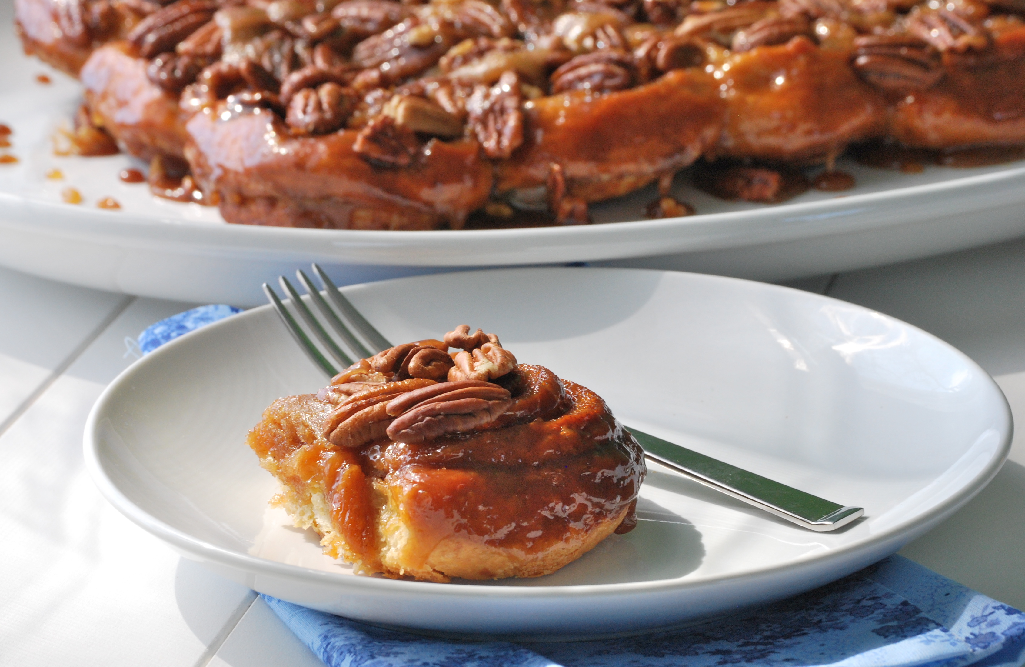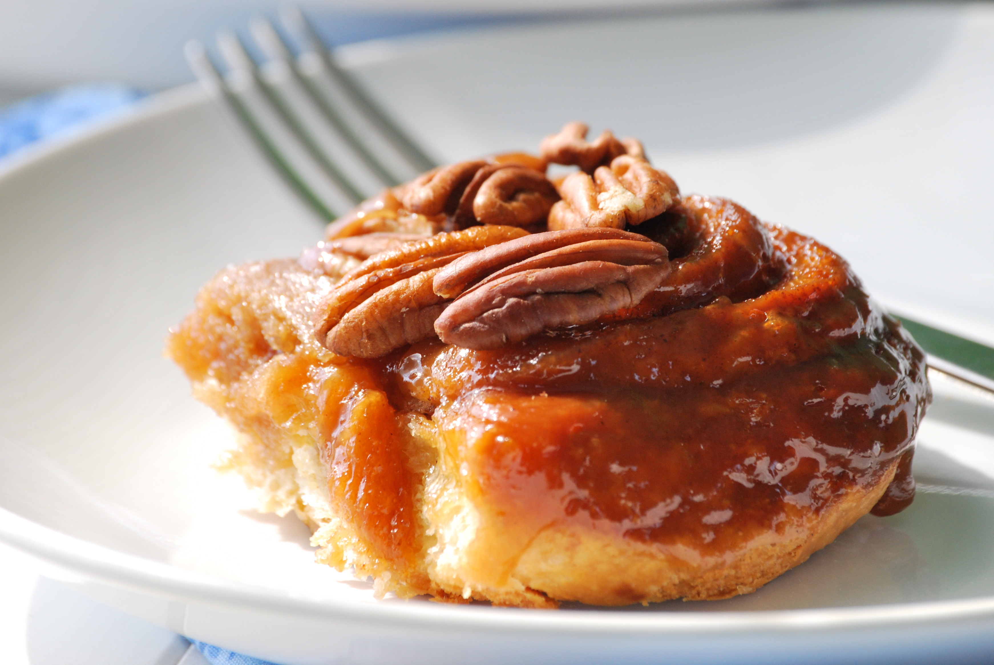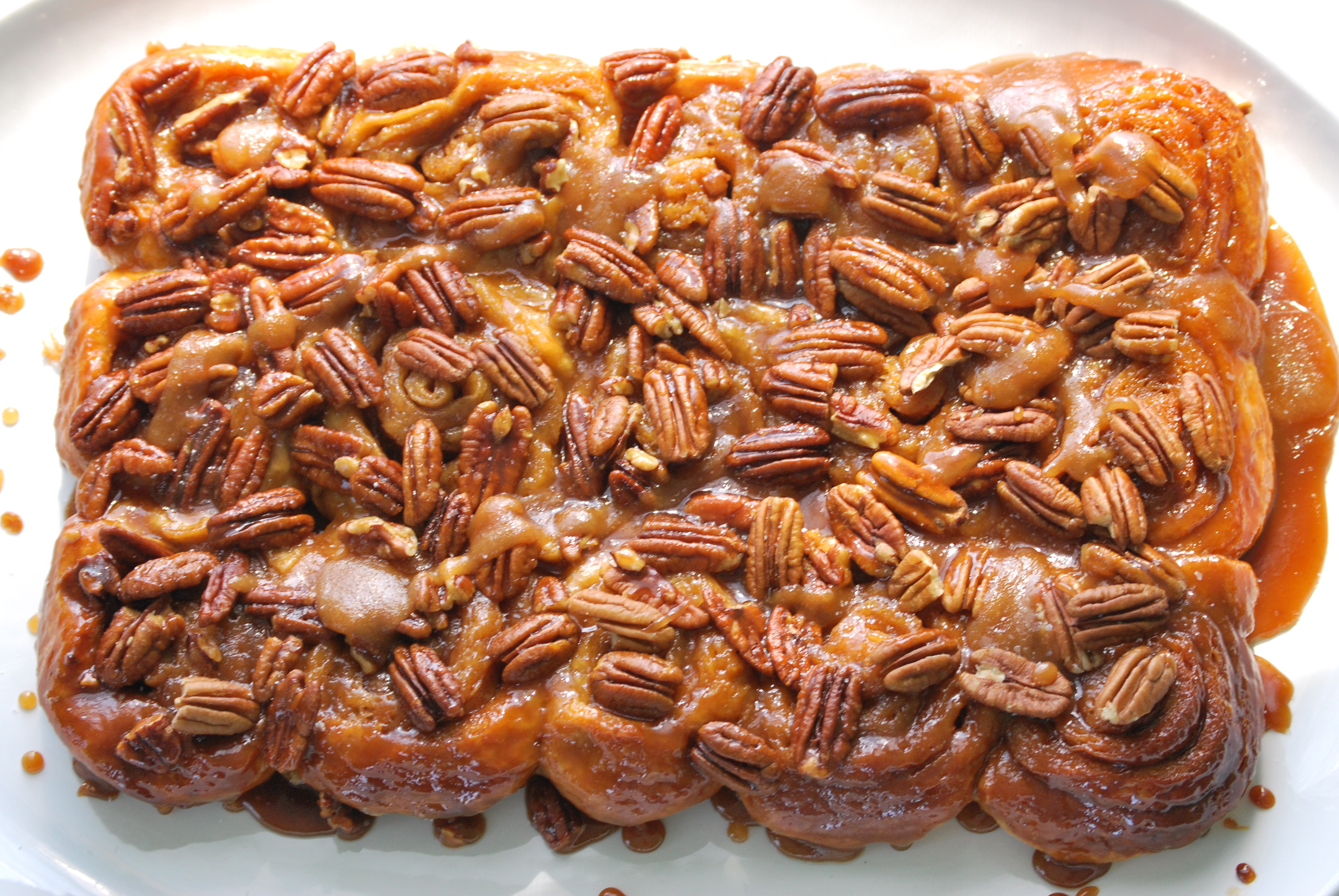 These buns are wonderful to prepare ahead of time. You can do this a few ways. First, the dough can be refrigerated (it needs to chill for at least to two hours before it can be rolled into buns, anyway). Another option is to finish the buns, get them into the pan, and refrigerate overnight. The rise time will be a bit longer (because the dough is cold), but it makes having a fresh sticky bun in the morning so much easier. Finally, you can just make them the night before– including the baking– since these one’s stay soft and moist. In the morning, just top them with the last of the caramel and toasted pecans. Hope you enjoy these sticky buns as much as we do!