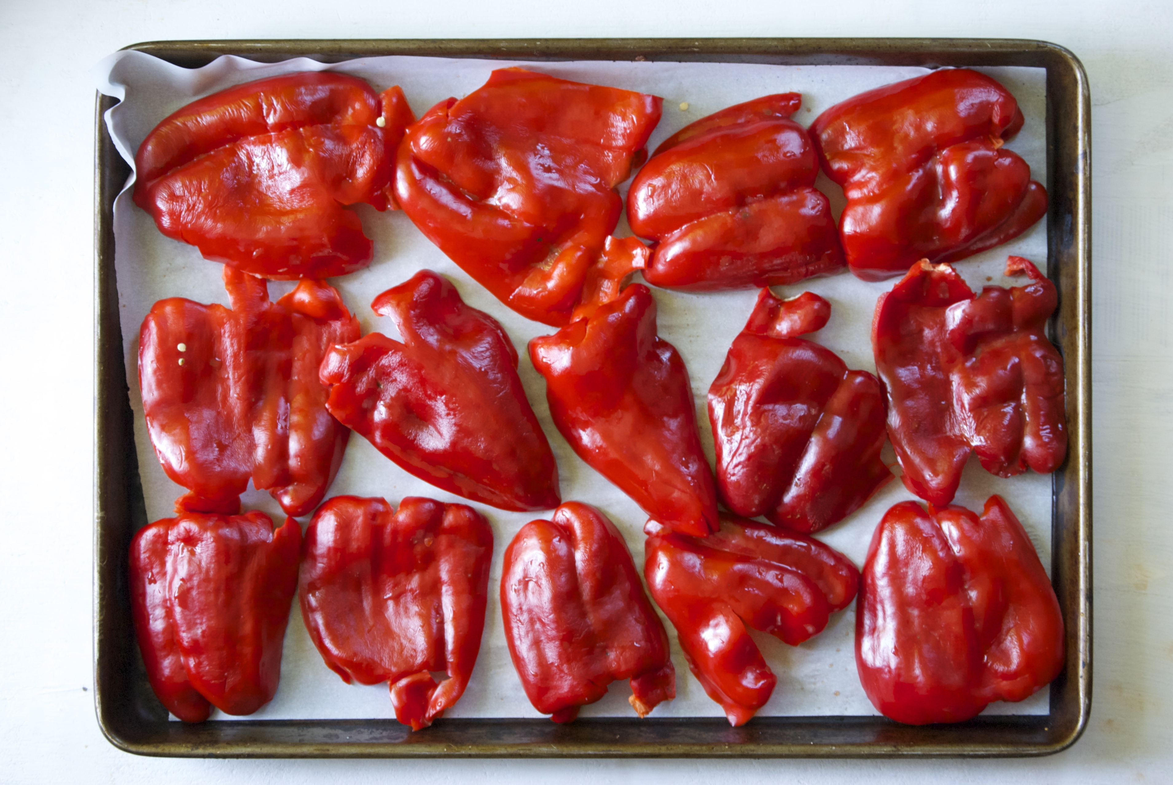 To Prepare the Red Peppers: Place oven rack close to the broiler unit. Line a large baking sheet with parchment paper. Cut the peppers in half and remove the insides. Place peppers on baking sheet and press down with your hand to flatten them. Place under broiler and broil them for about 15 minutes, or until they are very black. You will need to move the pan around and perhaps even rotate some of the peppers using tongs. Keep a close eye on them. Once they are done, remove from the pan and immediately place in a large resealable plastic bag. The steam will loosen the black skin. After 10 – 15 minutes or so, remove from the bag and slip the skin off using your fingers. It should come off easily. Discard the blackened portion. Chop the peppers in a food procesor or by hand.