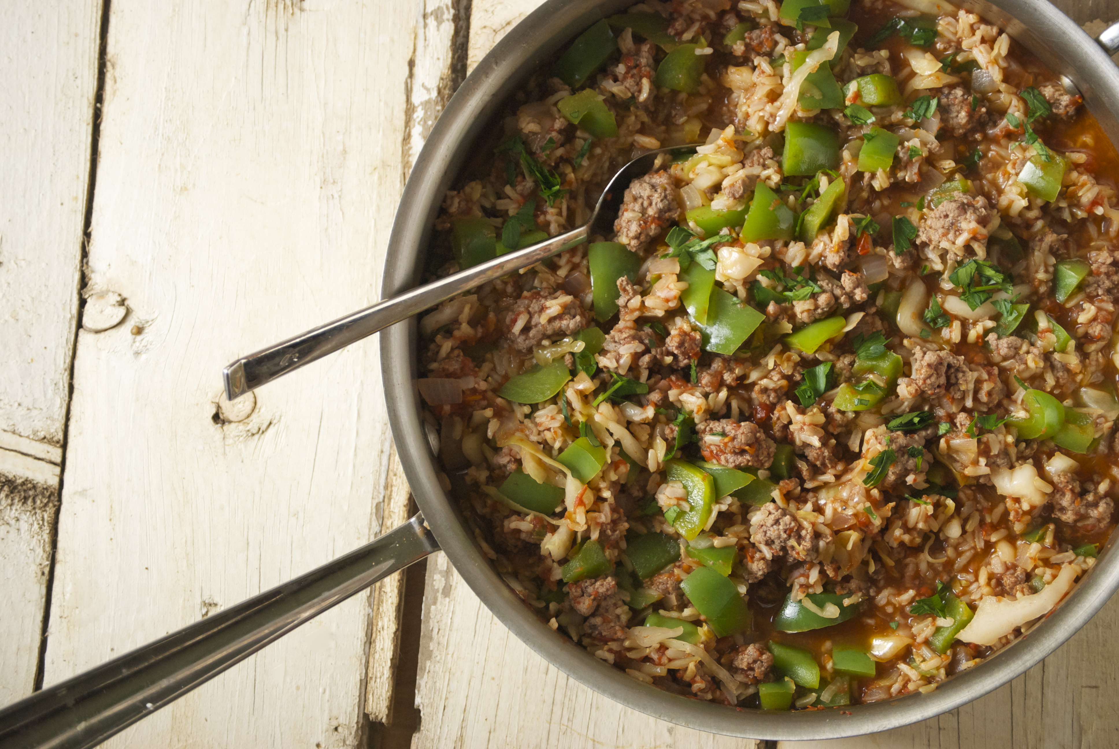 Just because this variation comes together more quickly, don’t for a moment think they aren’t as good as the original. That would be a huge mistake, because this dish is about 10 times better than any traditional version. Here’s why– you know that moment when you cut into what used to be a vibrant green pepper, and the liquid just floods out on to your plate because the pepper has baked far too long to ensure the filling reached the right temp? Yeah, that doesn’t happen here. No disappointing mushiness to the green pepper, no pieces of hamburger submerged in puddles of tomato-y water. Here, the green peppers retain their vibrant green color and a bit of their crunch, because you decide what texture you’d like them to be. The tomato sauce (or crushed tomatoes), whichever you choose to use, are the perfect base for the rice and ground beef. The whole dish is finished with a healthy dose of really good sauerkraut to add that wonderful zip. Use this saurkraut recipe to make your own, or buy a good quality version. Bubbies has wonderful fermented products. The entire dish takes only the amount of time that you need to make the brown rice. So…get going, time’s a ‘wasting! Enjoy!