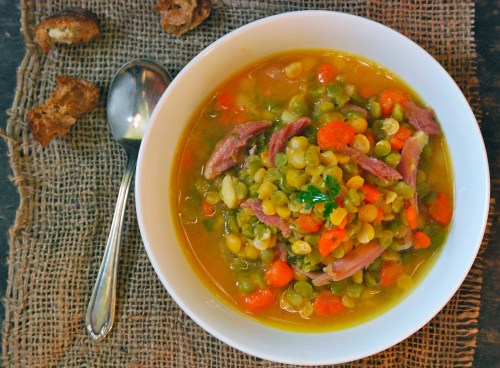 I get the impression that when most people hear ‘pea soup’, they evision a bowl of thick green goo. While I’ve seen my share of that style, I think– generally– split-pea soup has gotten a bad rap. It doesn’t have to be tasteless mush. Instead, split-pea soup can be beautiful, colorful, and full of amazing flavors and textures. Of course, peas pair perfectly with the rich, salty flavor of a smoked ham shank.
