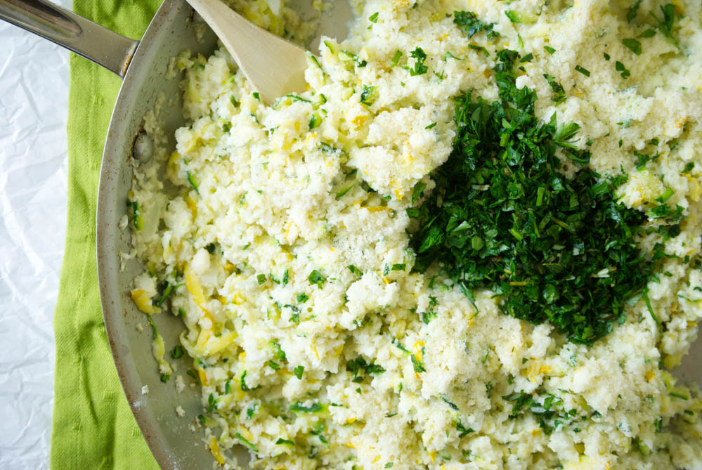 When the onion is softened, reduce heat to medium and stir in the cauliflower, garlic, zucchini, 1/2 teaspoon kosher salt, and pepper. Cook for about 7-8 minutes, until the vegetables are softened. Sprinkle flour over the mixture and stir to combine. Gradually stir in reserved zucchini water, milk, and cream, maintaining heat at medium so dairy does not curdle. Cook for 2-3 minutes so liquid absorbs slightly. Remove from heat. Stir in 1/3 cup parmesan, rosemary, and parsley. Pour into prepared dish and bake for 20 minutes. Remove from oven and top with remaining cheese (or more, if you like). Return to the oven for another 10 or so minutes until gratin is brown and bubbly. Sometimes I put the gratin under the broiler to brown up a bit faster for the final minute or two. Enjoy!