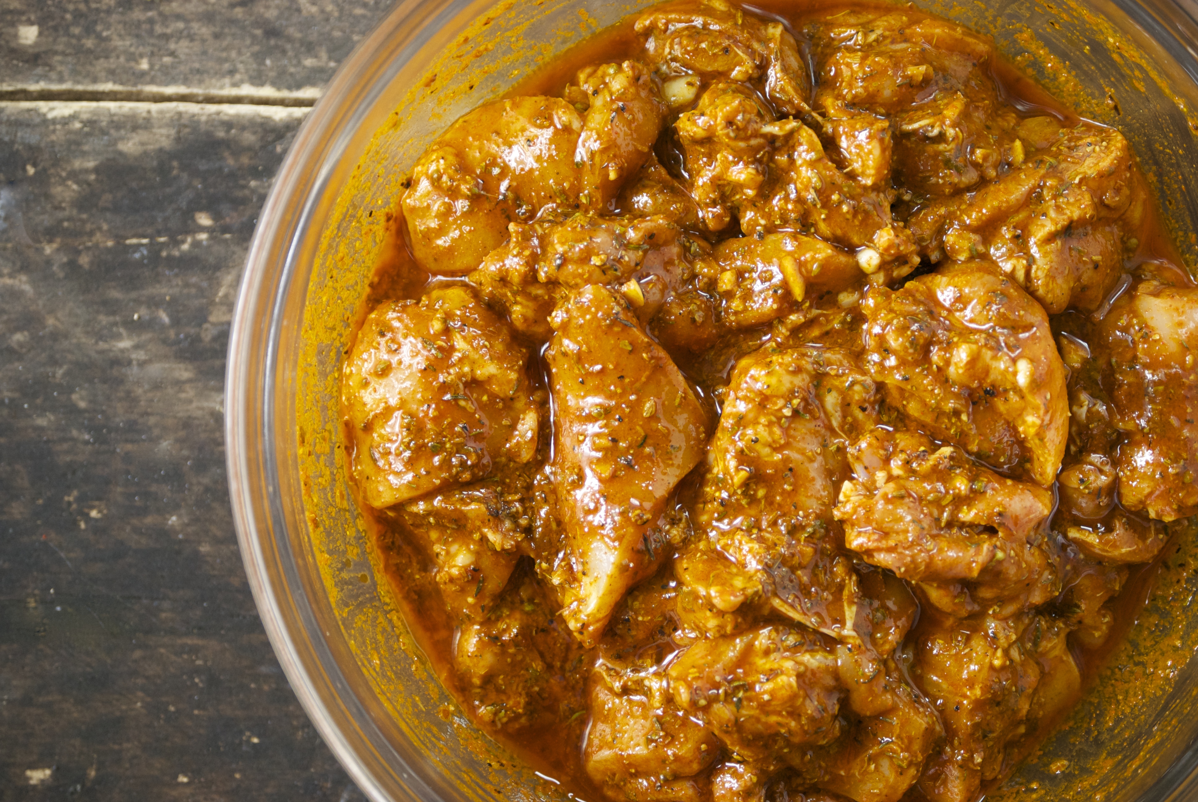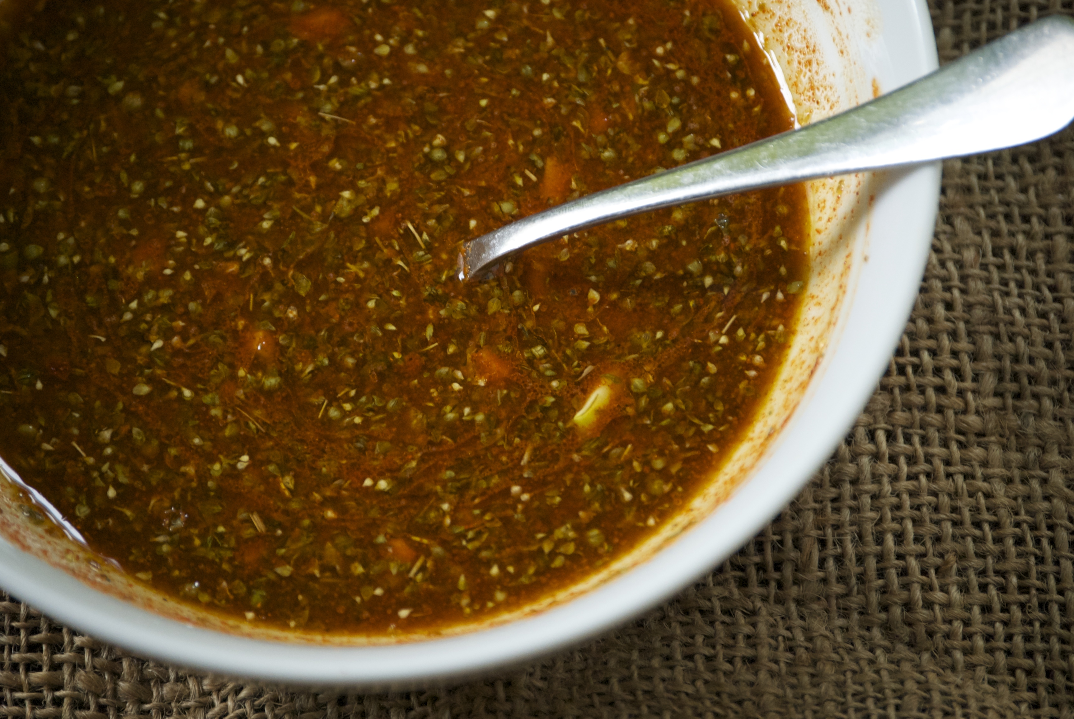 Make the vinaigrette by mixing the garlic clove, mustard, thyme leaves, and red wine vinegar together. Then whisk in the olive oil. Season with salt and pepper.